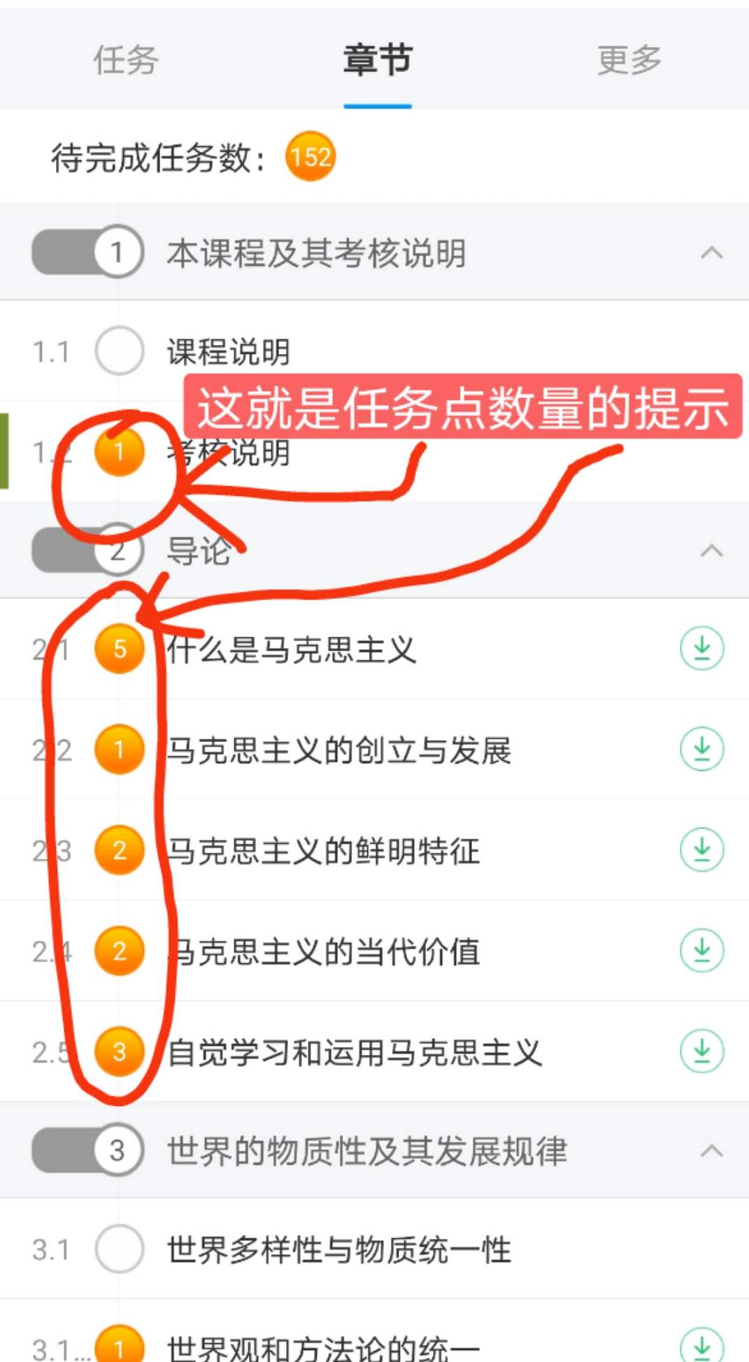 1.每个章节的左边顶头处有关于任务点总数量、具体位置的提示,如图所示: