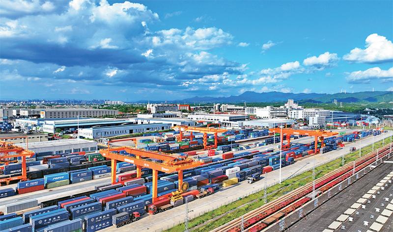 图为2024年5月5日,江西省赣州市南康区,赣州国际陆港车来车往、货如轮转,起重机在装卸进出口货物集装箱。 人民图片 朱海鹏/摄