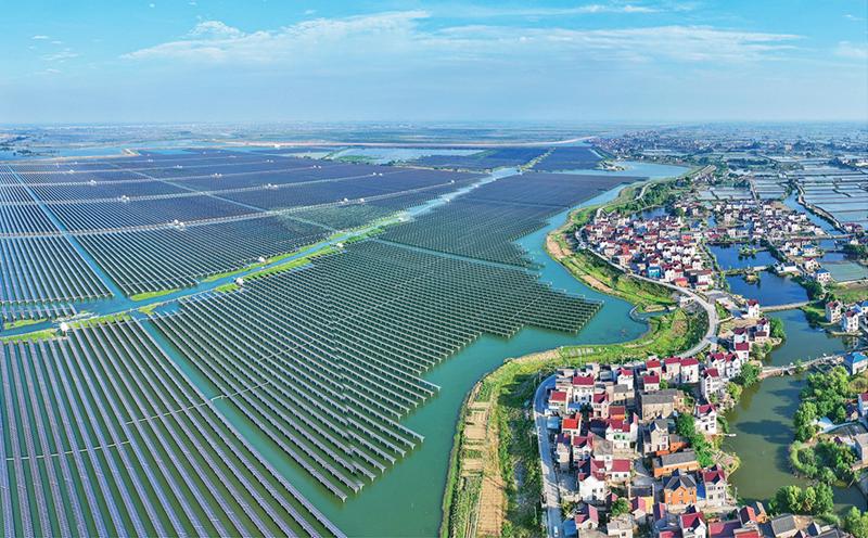 图为2024年5月20日,安徽省马鞍山市当涂县大陇镇的双潭湖渔光互补光伏电站。 人民图片 李成林/摄