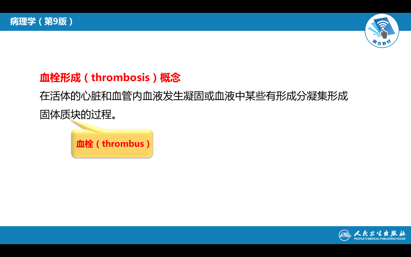 在活体的心血管内,血液发生凝固或血液中某些有形成分析出、凝集形成固体质块的过程,称为血栓形成(thrombosis)。所形成的固体质块称为血栓(thrombus)。与血凝块不同的是,血栓是在血液流动的状态下形成的。