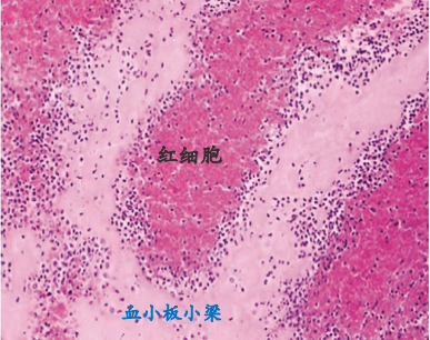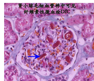 最常见于弥漫性血管内凝血(DIC),其发生于微循环的小血管内,只能在显微镜下才能见到,主要由嗜酸性同质性的纤维素构成,又称为微血栓(microthrombus)或纤维素性血栓(fibrinous thrombus)。
