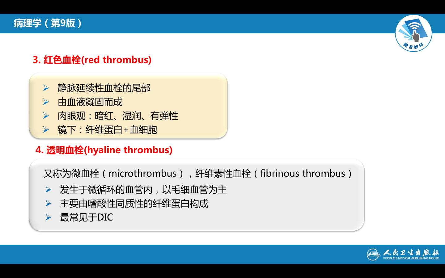 肉眼:呈暗红色、湿润、有弹性、与血管壁无粘连,与死后血凝块相似。经过一段时间,红色血栓由于水分被吸收,变得干燥、无弹性、质脆易碎,可脱落形成栓塞。