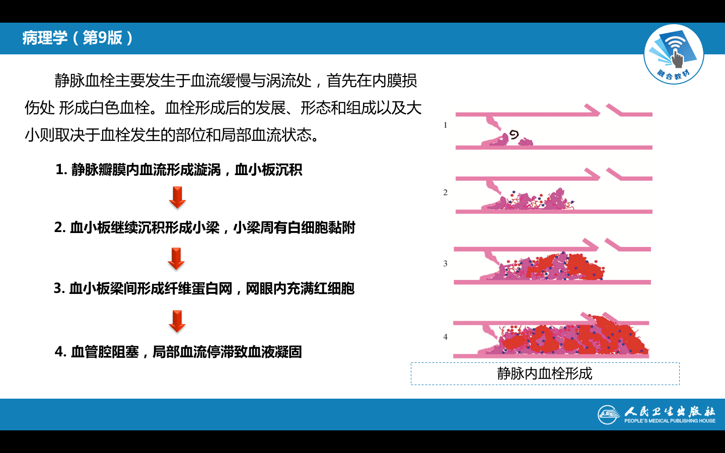 部位:主要见于静脉,随着混合血栓逐渐增大阻塞血管腔,使血流下游局部血流停止致血液凝固,常构成延续性血栓的尾部。红色血栓形成过程与血管外凝血过程相同。