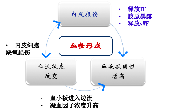 血栓形成是血液在流动状态中由于血小板的活化和凝血因子被激活而发生的异常凝固。血栓形成的条件目前公认是由Virchow提出的三个条件: