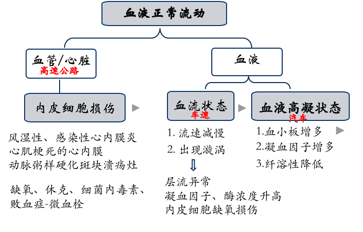 必须强调的是上述血栓形成的条件往往是同时存在的,并常以某一条件为主。如下图: