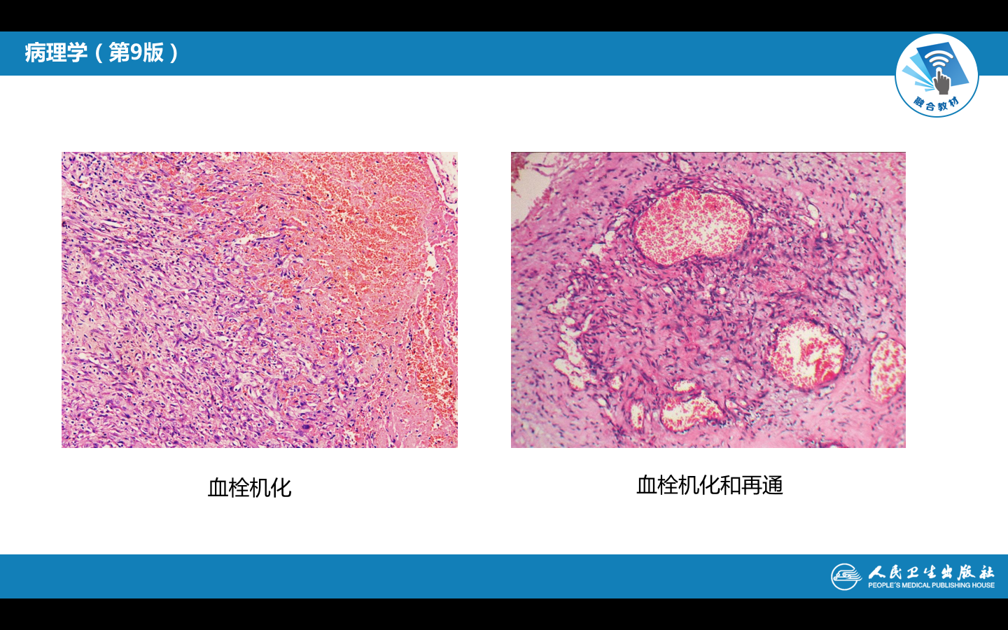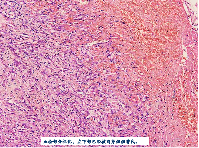 若纤溶酶系统的活力不足,血栓存在较久时则发生机化。由血管壁向血栓内长入肉芽组织,逐渐取代血栓,这一过程称为血栓机化。在血栓机化过程中,由于水分被吸收,血栓干燥收缩或部分溶解而出现裂隙,被新生的内皮细胞被覆于表面而形成新的血管,并相互吻合沟通,使被阻塞的血管部分地重建血流的过程,称为再通(recanalization)。