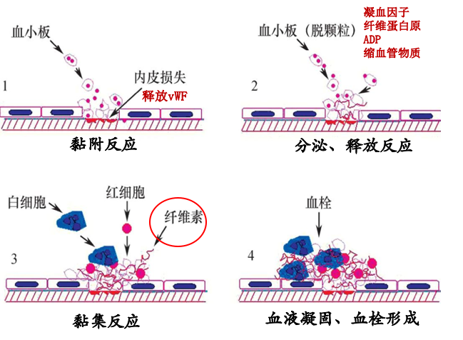 无论心脏或血管内的血栓,其形成过程都是以血小板粘附于内膜裸露的胶原开始,所以血小板粘集堆的形成是血栓形成的第一步,嗣后血栓形成的过程及血栓的组成、形态、大小都取决于血栓发生的部位和局部血流速度。