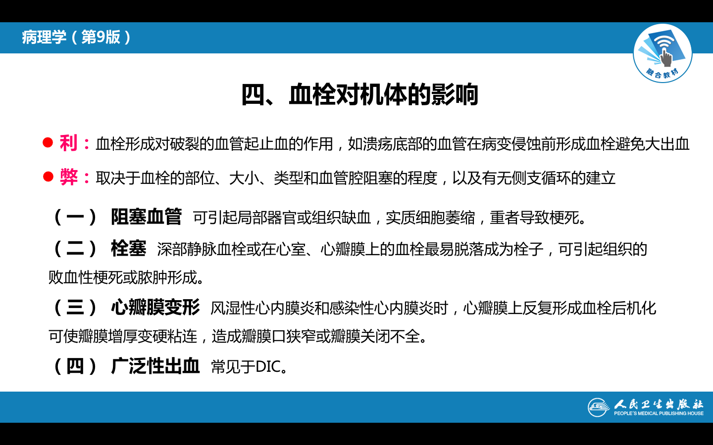 血栓形成对破裂的血管起堵塞裂口和止血的作用。这是对机体有利的一面。如慢性消化性溃疡底部和肺结核性空洞壁的血管,在病变侵蚀前已形成血栓,避免了大出血的可能性。但多数情况下血栓形成对机体则造成不利的影响。