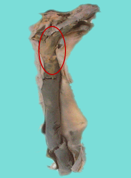 部位:血栓在形成血栓头部后,致其下游引起血流减慢和血流漩涡,从而再形成一个血小板小梁的凝集堆,在血小板小梁之间,血液发生凝固,纤维素形成网状结构,其内充满大量的红细胞,此过程交替进行,致形成肉眼上灰白色与红褐色交替的层状结构,称为层状血栓,即混合血栓。肉眼:呈粗糙干燥的圆柱状,与血管壁粘连,构成延续性血栓的体部。动脉瘤、室壁瘤内的附壁血栓(mural thrombus)及扩张的左心房内的球状血栓亦属此类。镜下:主要由淡红色无结构的不规则珊瑚状的血小板小梁和小梁间由充满红细胞的纤维素网所构成,并见血小板小梁边缘有较多的中性白细胞粘附。