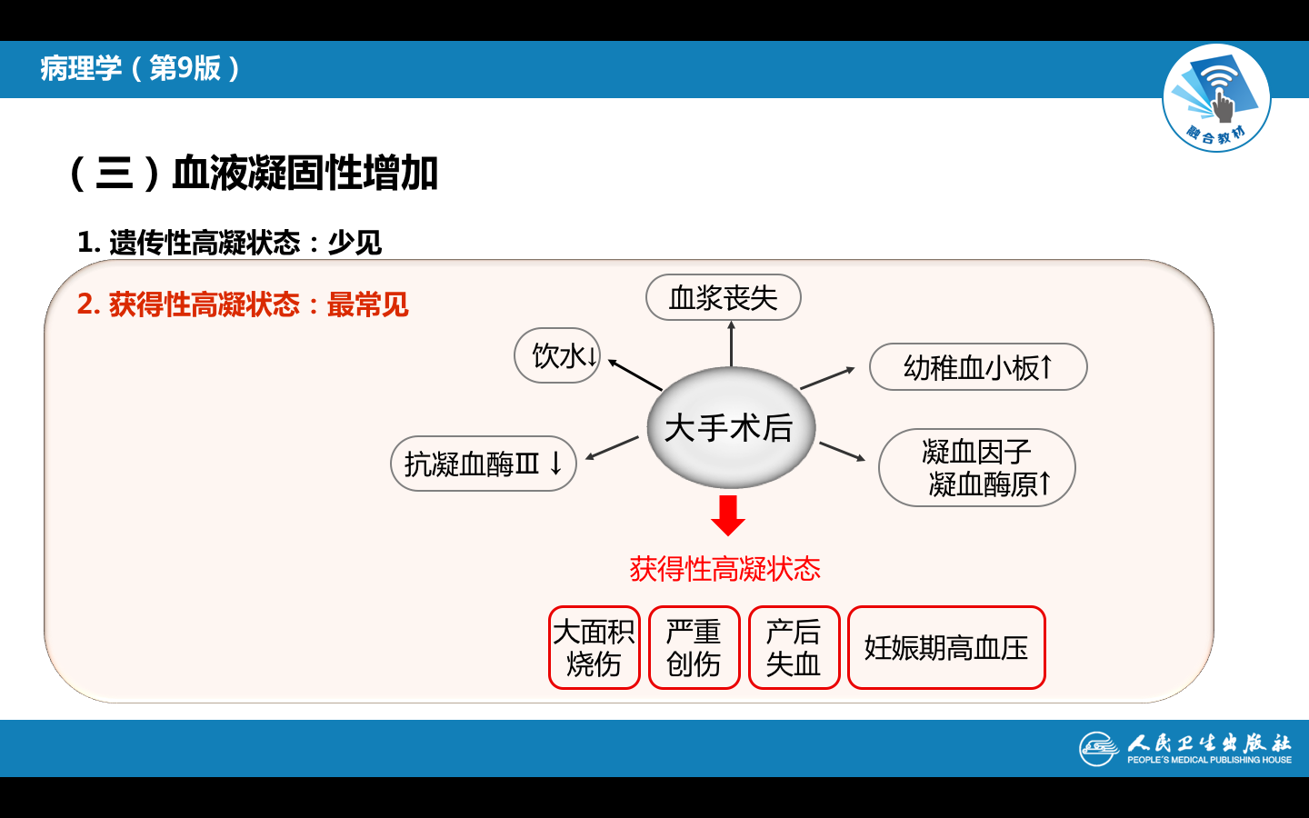 是指血液中血小板和凝血因子增多,或纤维蛋白溶解系统的活性降低,导致血液的高凝状态。此状态可见于遗传性和获得性疾病。在高凝血遗传性原因中,最常见为第V因子和凝血酶原的基因突变。在严重创伤、大面积烧伤、大手术后或产后导致大失血时血液浓缩,血中纤维蛋白原、凝血酶原及其它凝血因子(Ⅻ、Ⅶ)的含量增多,以及血中补充大量幼稚的血小板,其粘性增加,易于发生粘集形成血栓。