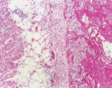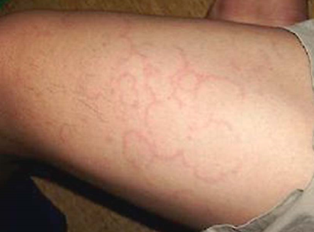 1. 皮肤环形红斑 皮肤的风湿性病变中最多见的和具有诊断意义的病变是环形红斑。见于躯干及四肢,直径约3cm,边缘红晕,中心保持皮肤本色(图4-7)。镜下,为渗出性病变,真皮浅层血管扩张充血,血管周围组织水肿,淋巴细胞、单核细胞及少许中性粒细胞浸润。常在1~2天内消失。
