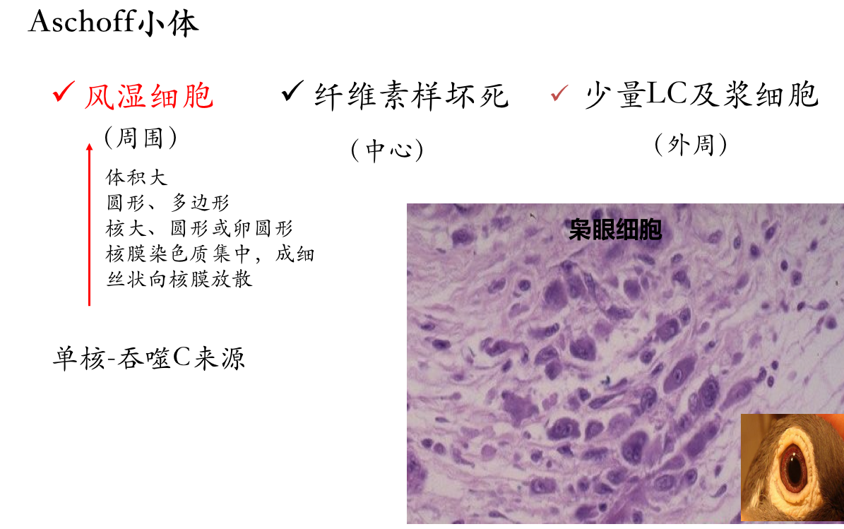 风湿细胞体积较大,圆形、卵圆形,胞浆丰富,略嗜碱性,核大圆形或卵圆形,核膜清晰,核染色质集中于中央,横切面呈枭眼状,纵切面呈毛虫状。也可见多个核的Aschoff巨细胞。纤维素样坏死、成团的风湿细胞及伴有的淋巴细胞、浆细胞等共同组成的具有特征性的病变为风湿小体或阿少夫小体(Aschoff baody)。