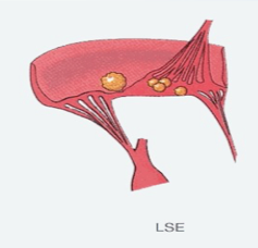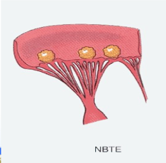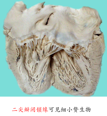 肉眼观,病变早期受累的瓣膜肿胀、增厚,失去光泽,继而病变瓣膜不断受到血流冲击和瓣膜不停的关闭和开放等摩擦作用,使瓣膜表面,尤以闭锁缘处内膜损伤,形成粗糙面,导致血小板在该处沉积、凝集,形成串珠状单行排列的,大小如粟粒(1~3mm),灰白色,半透明的,与瓣膜粘连牢固不易脱落的疣状赘生物(图4-1)。