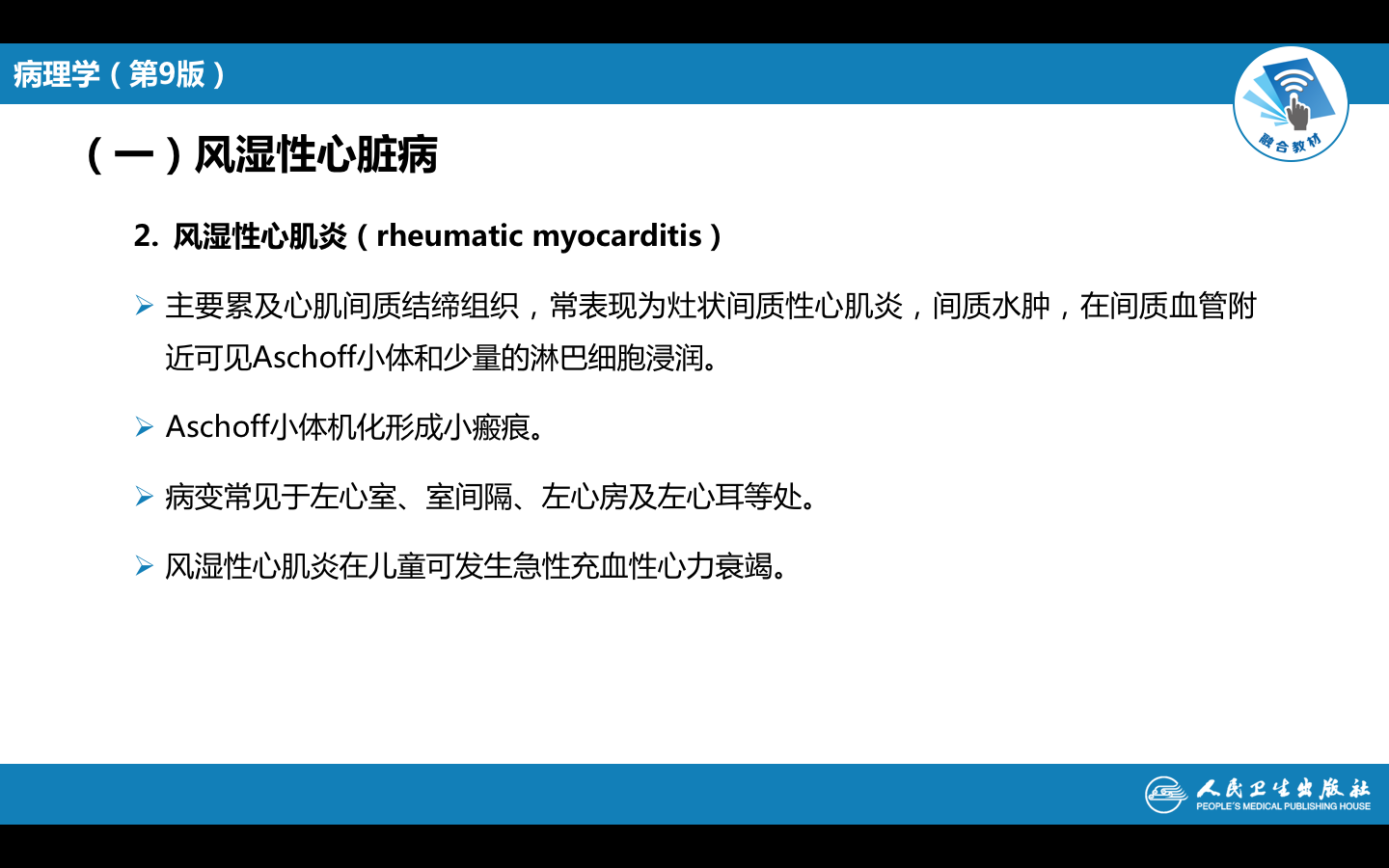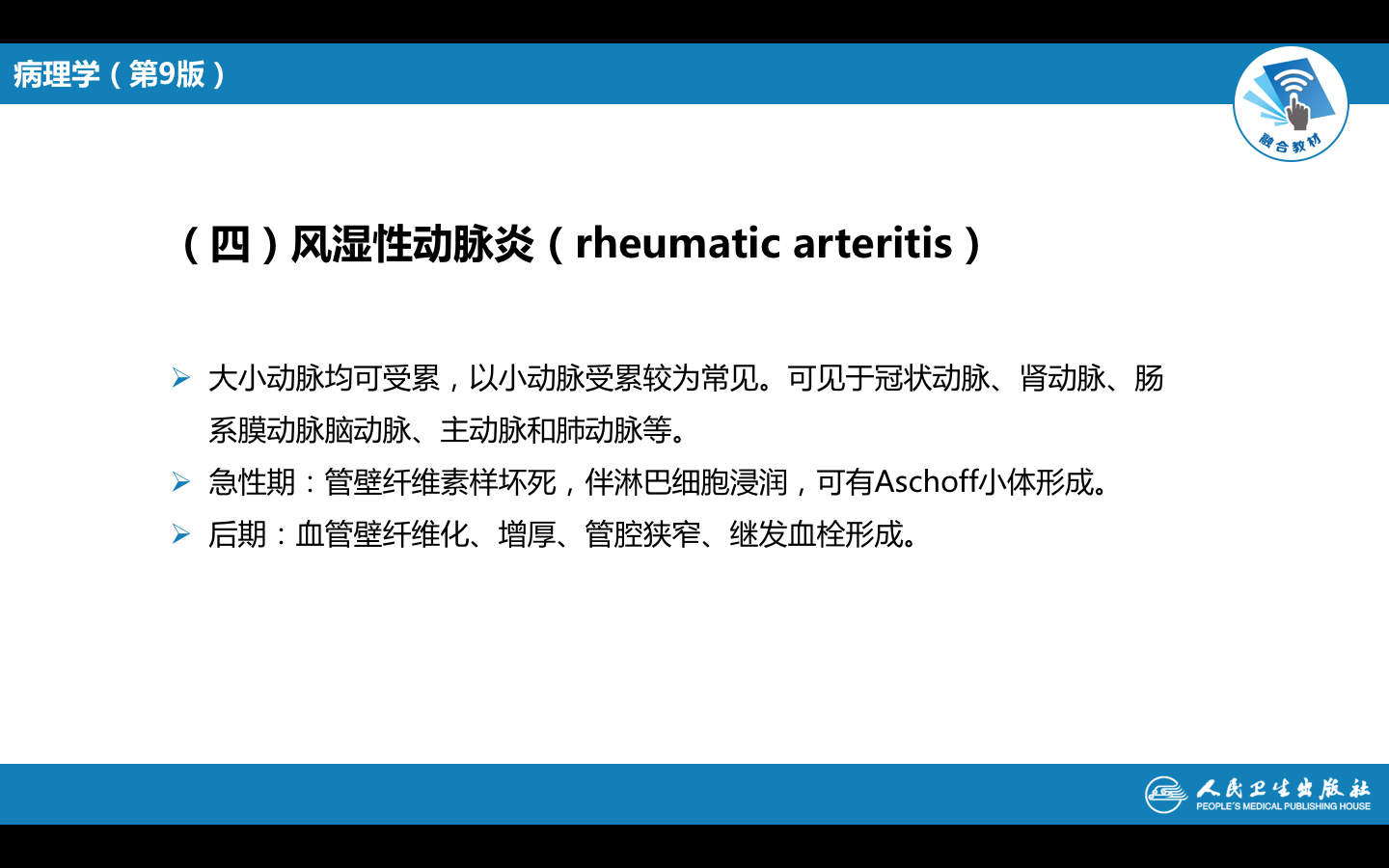 风湿性动脉炎(rheumatic arteritis)风湿性动脉炎可发生于大小动脉,如冠状动脉、肾动脉、肠系膜动脉、脑动脉及肺动脉等,并以小动脉受累较多见。急性期血管壁结缔组织黏液样变性及纤维素样坏死和炎细胞浸润,可有阿少夫小体形成。后期,血管壁结缔组织增厚,管腔狭窄,甚至闭塞。风湿性冠状动脉炎时,临床上可出现与冠心病相似的心肌缺血症状。