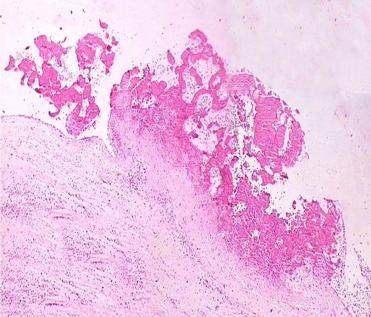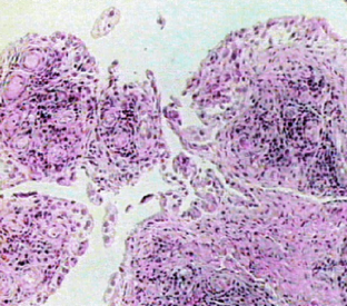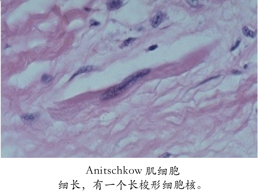 镜下,瓣膜胶原纤维肿胀,黏液样变性及纤维素样坏死。疣状赘生物是由血小板和纤维素构成的白色血栓。其基底部有少许的炎细胞浸润,有时可见肿大的纤维母细胞和多少不等的风湿细胞,典型的风湿小体少见(图4-2)。