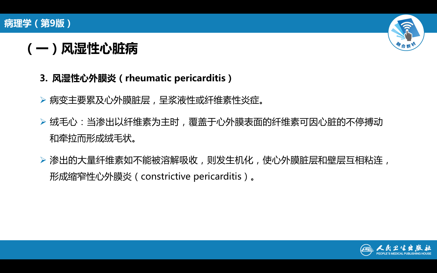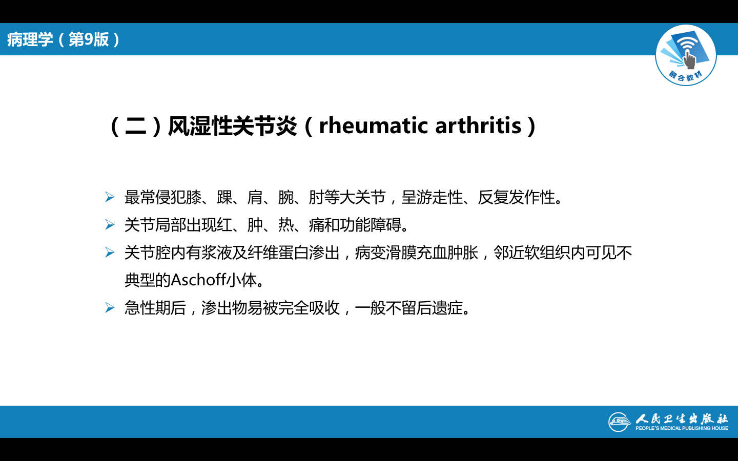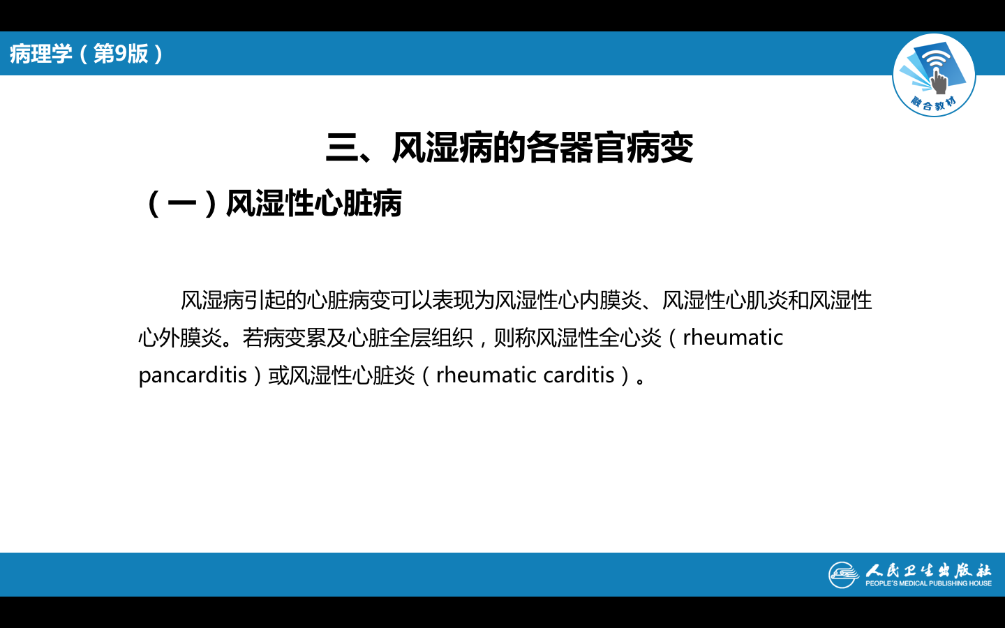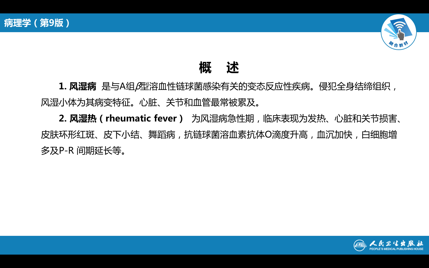 风湿病(rheumatism)是一种与A组乙型溶血性链球菌感染有关的变态反应性疾病。病变累及全身结缔组织,呈急性或慢性结缔组织炎症,主要为胶原纤维的变性和坏死。最常累及心脏和关节,其次是皮下 、浆膜、血管和脑。急性期称为风湿热(rheumatism fever)。临床上,除有心脏和关节症状外,常伴有发热、皮疹、皮下结节、小舞蹈病等症状和体征;血液检查,抗链球菌溶血素O抗体滴度增高,血沉加快等。