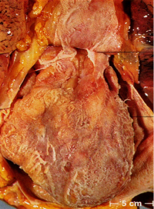 心:约为死者拳头两倍大小,重380g(正常250g),外观近似球形,心尖钝圆,各心腔均扩张。二尖瓣闭锁缘可见几个栗粒大灰白色半透明赘生物,与瓣膜粘连较牢。二尖瓣瓣膜增厚、卷曲、短缩,瓣叶之间粘连,形成鱼口样外观。镜下,赘生物主要由血小板和纤维蛋白构成。左心室心肌间可见纤维蛋白样坏死,并见多数圆形或椭圆形细胞聚集,胞质略嗜碱性,核膜清晰,染色质集中于核的中心,尚有少量淋巴细胞及单核细胞浸润。