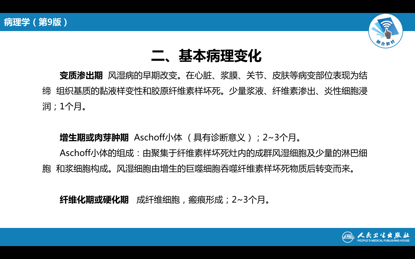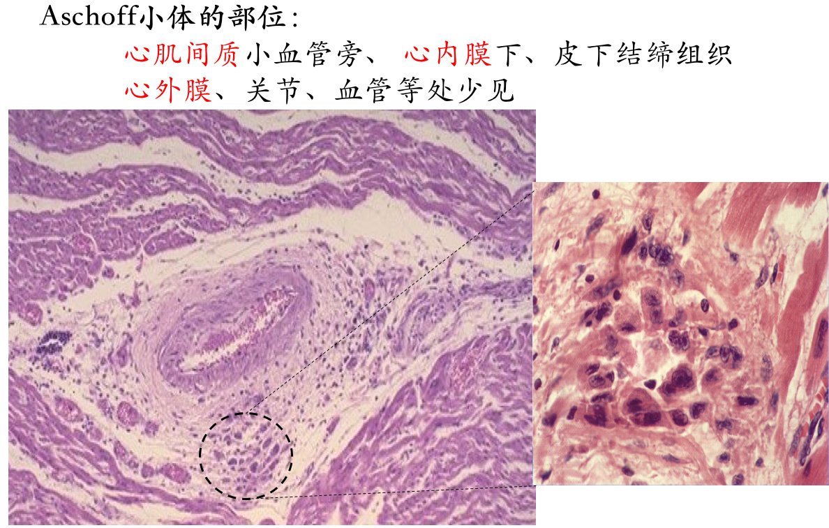 此期特点是在变质渗出的病变基础上形成具有特征性的病变,称之为风湿小体或阿少夫小体(Aschoff body),又称风湿小结或风湿性肉芽种(见下图)。
