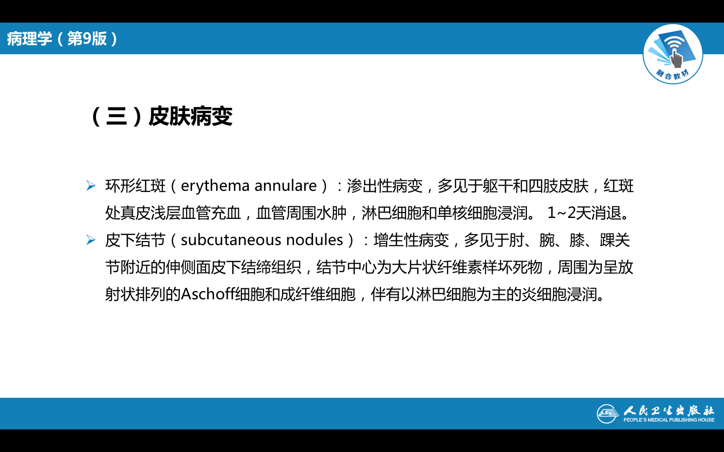 皮肤的风湿性病变可表现为皮肤环形红斑和皮下结节。