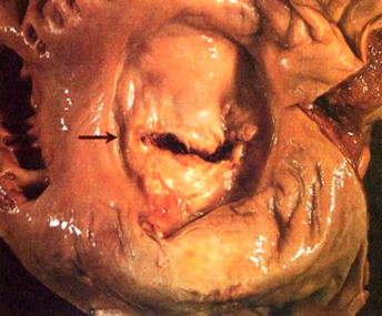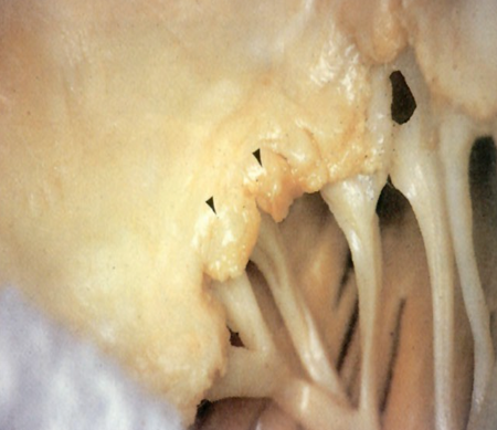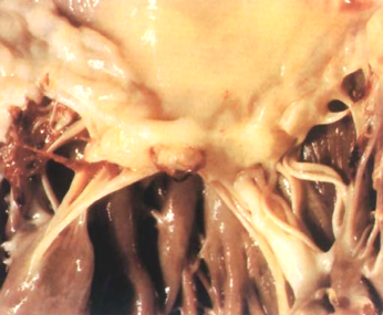 病变后期,心内膜下风湿病变发生纤维化,心瓣膜和腱索中的赘生物发生机化,形成灰白色瘢痕。导致瓣膜增厚、变硬、卷曲、缩短,瓣叶之间发生纤维性粘连,腱索增粗和缩短,最终导致瓣膜病(瓣膜狭窄和/或瓣膜关闭不全,图4-3),引起血流动力学改变甚至心力衰竭。左心房后壁可因机化增厚、粗糙和皱缩,称为McCallum斑(McCallum patch)。