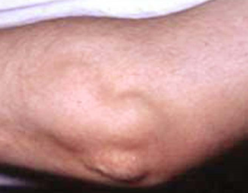 2. 皮下结节 多发生于腕、肘、膝、踝等大关节处的伸侧面皮下结缔组织,结节直径0.5~2cm,圆形或椭圆形,质地较硬,境界清楚,可活动,压之不痛(图4-8)。镜下,为增生性病变,结节中央为纤维素样坏死,周围有增生的纤维母细胞和风湿细胞围绕呈栅拦状排列,伴有淋巴细胞浸润。皮下结节的出现常与风湿性心脏病的发生有关。风湿活动停止后,结节纤维化,形成小瘢痕。
