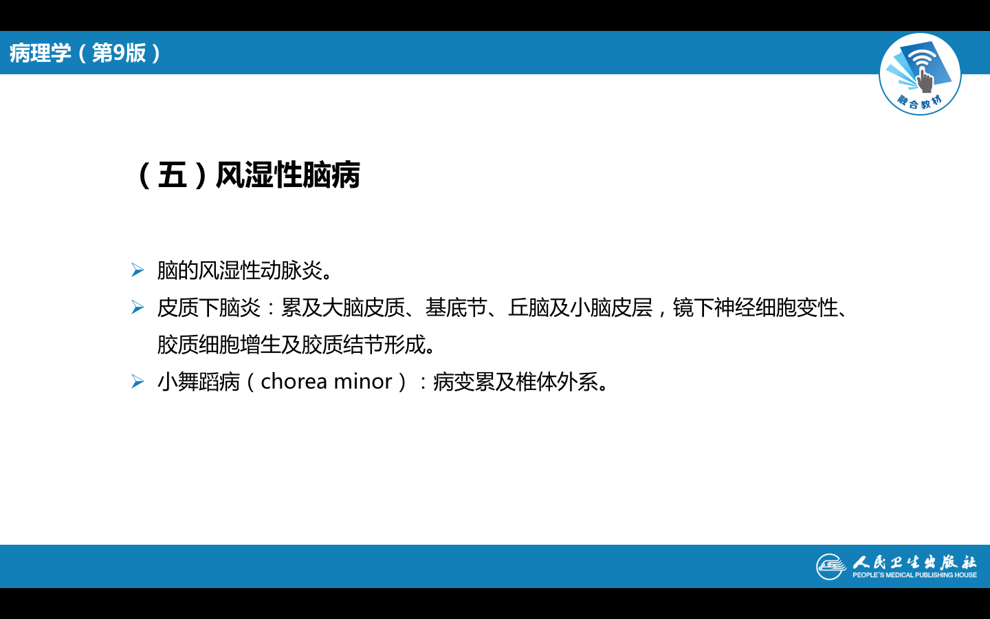 病变主要累及大脑皮质、基底节、丘脑及小脑皮质。多见于5~12岁儿童,女孩多见。表现为非特异性轻度脑膜炎或风湿性动脉炎,病变局部充血,血管周围淋巴细胞浸润,神经细胞变性及胶质细胞增生等改变。当病变侵犯锥体外系统时,患儿出现面肌及肢体不自主运动,临床上称为小舞蹈病。