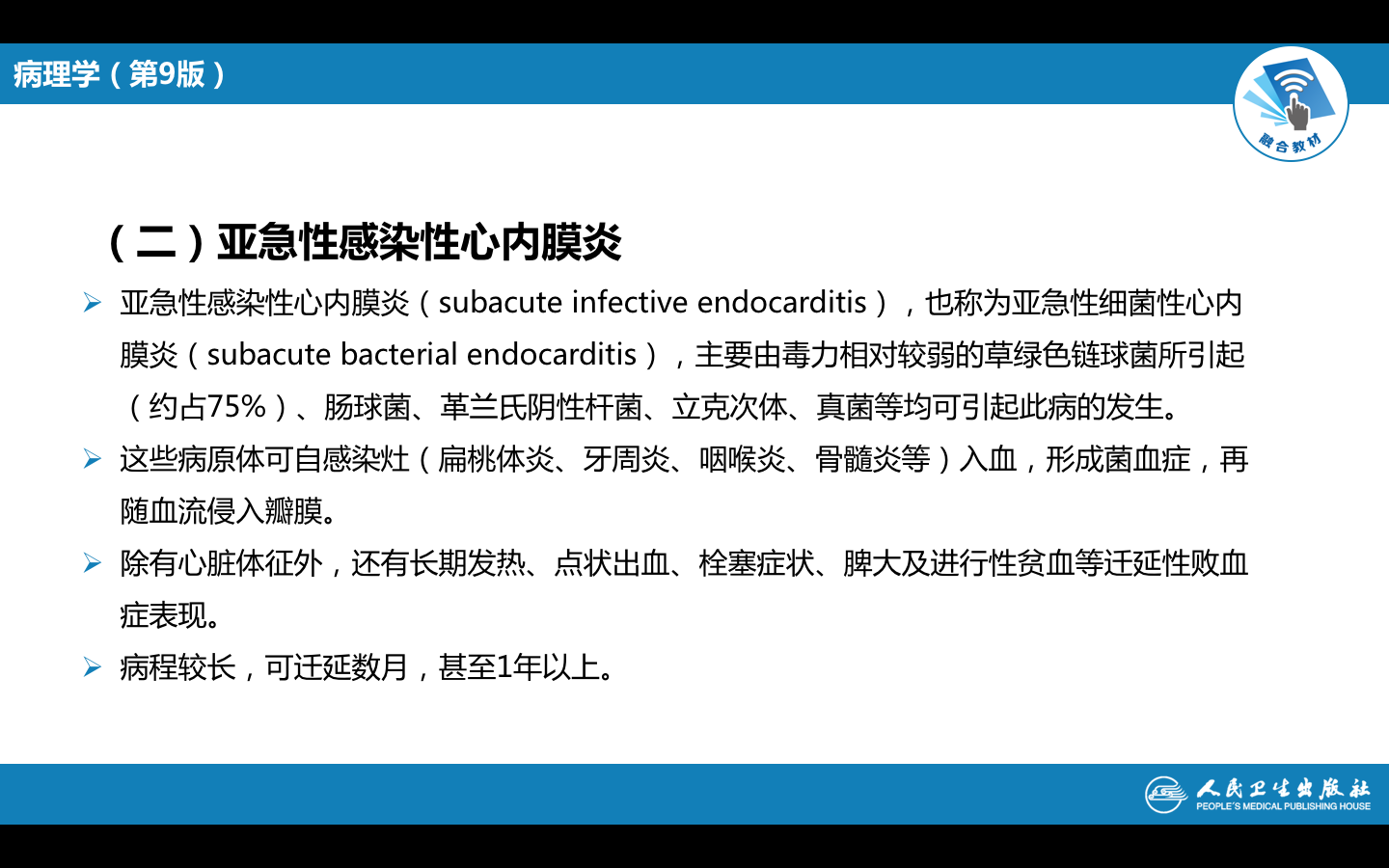 亚急性感染性心内膜炎(subacte infective endocardieis)通常由毒力较弱的细菌感染所引起,又称亚急性细菌性心内膜炎(subacute bacterial endocarditis,SBE)。改病病程经过6周以上,可以迁延数月乃至1~2年