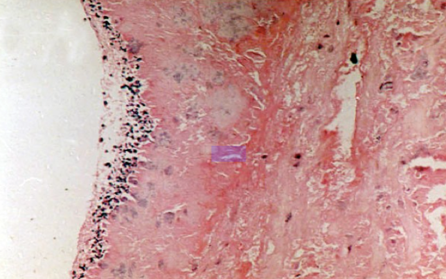 镜下,赘生物由血小板、纤维素、坏死组织、炎细胞、细菌菌落构成。细菌菌落包裹在赘生物内部。溃疡底部可见少许肉芽组织及淋巴细胞、单核细胞浸润。有时可见原有风湿性心内膜炎的病变。
