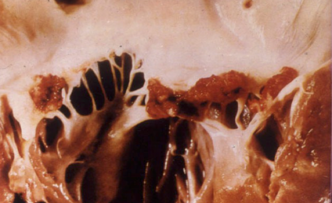 本病的病原菌主要为毒力较弱的草绿色链球菌所引起,其次是肠球菌、肺炎球菌和淋球菌乃至真菌也可引起。亚急性感染性心内膜炎常发生在已有病变的瓣膜上,大多数病例发生在风湿性心内膜炎的基础上。此型心内膜炎常见于二尖瓣和主动脉瓣,并可累及其它部位心内膜,三尖瓣和肺动脉瓣少见。