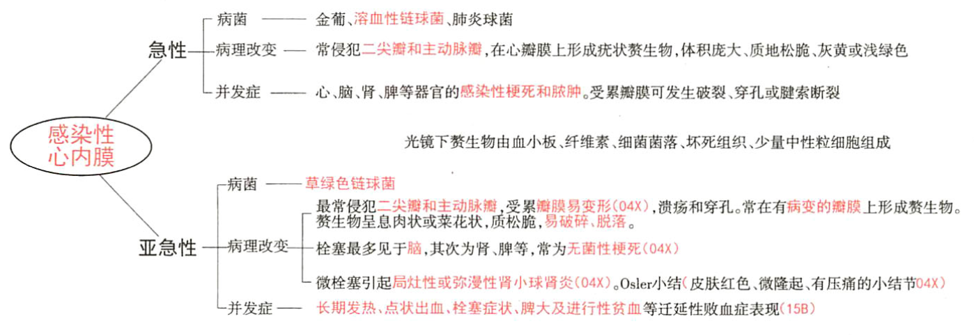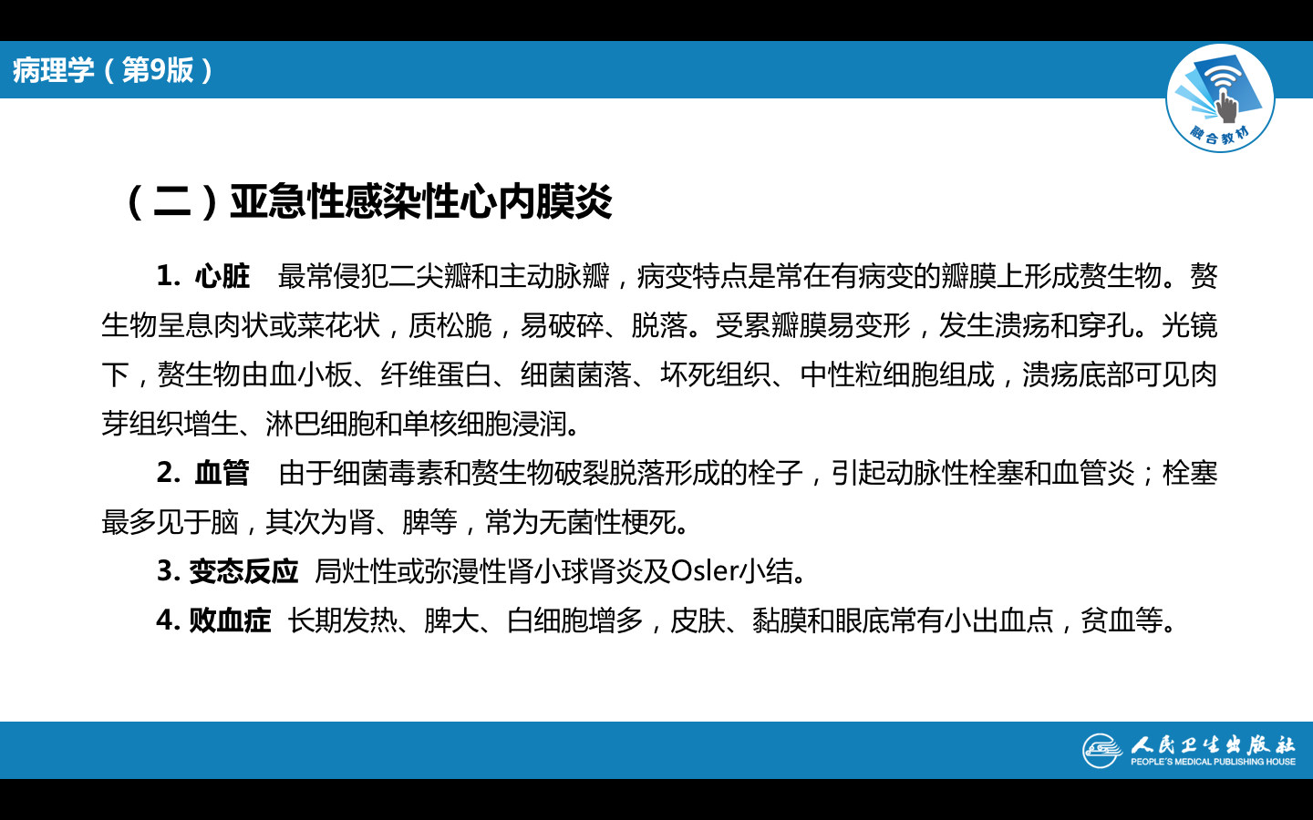 4.败血症 由于赘生物中的细菌和毒素不断侵入血流,患者有长期发热。皮肤、黏膜和眼底部有出血,这是由于血管壁损伤,通透性升高所致。脾肿大、白细胞增多则表现为单核巨噬细胞增生,脾窦扩张充血。因脾功能亢进和草绿色链球菌的轻度溶血作用,因此,患者可出现贫血。血培养阳性是诊断本病的重要依据。