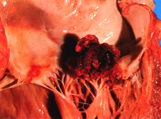 肉眼观,常在原有病变的瓣膜上形成赘生物。病变瓣膜增厚、变形,并发生溃疡,甚至穿孔和腱索断裂,其表面赘生物大小不一,单个或多个,形态不规则呈息肉状或鸡冠状,颜色呈灰黄色或灰绿色,干燥质脆,易破碎和脱落成为栓子,引起栓塞(图2-3)。