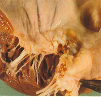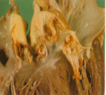1.瓣膜损害 病变瓣膜僵硬,部分机化瘢痕形成,极易造成严重的瓣膜变形、增厚和腱索增粗缩短,导致瓣膜口狭窄和/或关闭不全,体检时可听到相应部位杂音