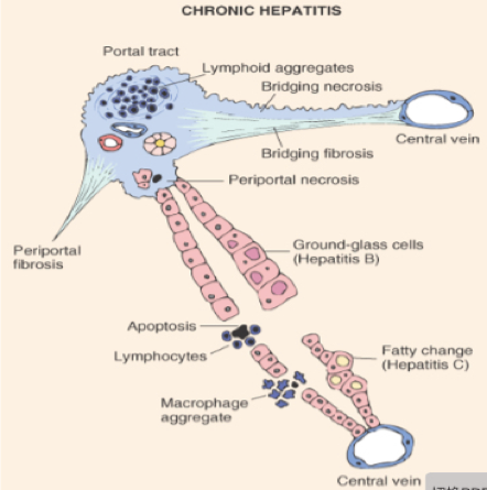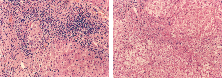 (3)脂肪变性:肝细胞脂肪变性常发生在丙型肝炎。