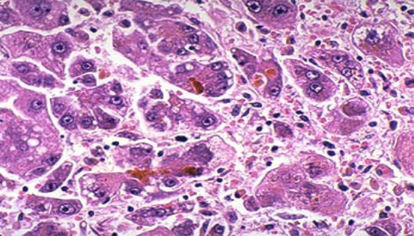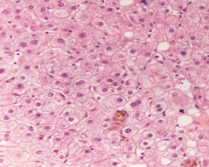 镜下见广泛的肝细胞变性,以胞浆疏松化和气球样变最为普遍。肝小叶内可有散在的点状坏死。嗜酸性小体并不常见。由于肝细胞索网状纤维支架没有塌陷,故再生的肝细胞可完全恢复原来的结构和功能。门管区及肝小叶内有少量炎细胞浸润。黄疸型者坏死灶稍多、稍重,毛细胆管管腔中有胆栓形成。