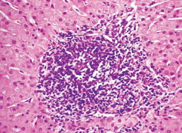 (1)点状或灶性坏死(spotty necrosis):肝小叶内散在的灶状肝细胞坏死。每个坏死灶仅累及1至几个肝细胞,同时该处伴以炎细胞浸润。