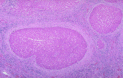 (3)桥接坏死(bridging necrosis):是指坏死灶呈条索状向小叶内伸展构成中央静脉之间、门管区之间或中央静脉与门管区之间的桥状连接。坏死处伴有肝细胞不规则再生及纤维组织增生,后期成为纤维间隔而分隔小叶。常见于中、重度慢性肝炎。
