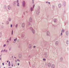 (1)水变性:在病毒性肝炎中很常见。是由于肝细胞受损后细胞内水分较正常明显增多所致。镜下见肝细胞肿大、胞浆疏松呈网状、半透明,称胞浆疏松化。进一步发展,肝细胞胀大呈球形,胞浆几乎完全透明,称为气球样变。肝窦因肝细胞肿胀而受压变窄。高度气球样变的肝细胞最终可发生溶解坏死(重型肝炎时肝细胞的变性往往不明显,很快就发生坏死崩解)。