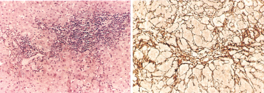 (2)中度慢性肝炎:肝细胞坏死明显,有中度碎片状坏死和特征性的桥接坏死。小叶内有纤维间隔形成,但小叶结构大部分保存。