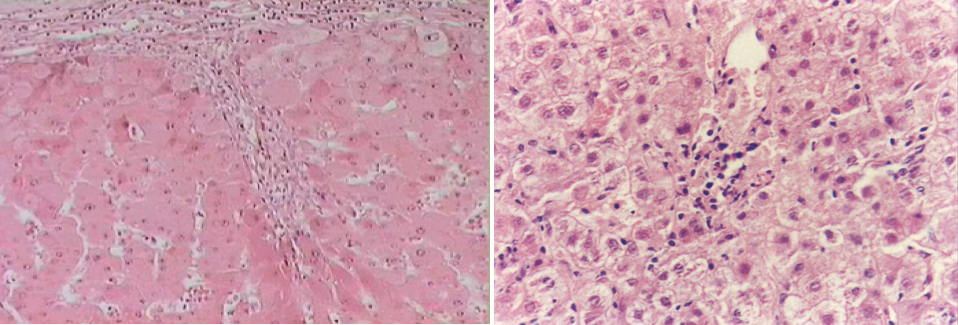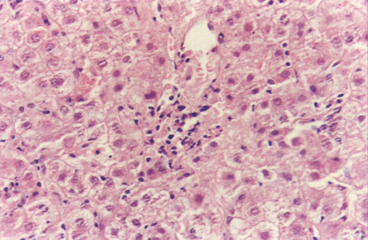 (1)轻度慢性肝炎:肝细胞变性,点灶状坏死或凋亡小体,偶见轻度碎片状坏死,门管区周围纤维增生,肝小叶结构完整。