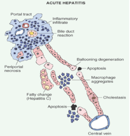 由于肝细胞弥漫地变性肿胀,使肝体积增大,包膜紧张,为临床上肝大、肝区疼痛或压痛的原因。由于肝细胞坏死,释出细胞内的酶类入血,故血清谷丙转氨酶等升高,同时还可引起多种肝功能异常。肝细胞坏死较多时,胆红质的摄取、结合和分泌发生障碍,加之毛细胆管受压或有胆栓形成等则可引起黄疸。