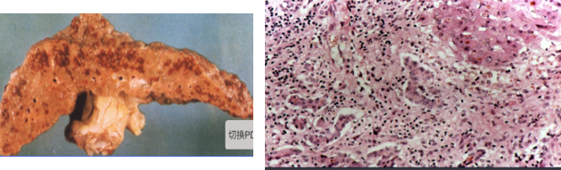 (2)亚急性重型肝炎:多数是由急性重型肝炎迁延而来或一开始病变就比较缓和呈亚急性经过。少数病例可能由普通型肝炎恶化而来。本型病程可达一至数月。病变特点是既有大片的肝细胞坏死,又有肝细胞结节状再生。由于坏死区网状纤维支架塌陷和胶原纤维化,致使再生的肝细胞失去原有的依托呈不规则的结节状,失去原有小叶的结构和功能。小叶内外有明显的炎细胞浸润。小叶周边部小胆管增生并可有胆汁淤积形成胆栓。肉眼观,肝不同程度缩小,被膜皱隔,呈黄绿色(亚急性黄*色肝萎缩)。病程长者可形成大小不等的结节,质地略硬。切面黄绿色(胆汁淤积),交错可见坏死区及小岛屿状再生结节。此型肝炎如及时治疗有停止进展和治愈的可能。病程迁延较长(如1年)者,则逐渐过渡为坏死后性肝硬化。病情进展者可发生肝功能不全。
