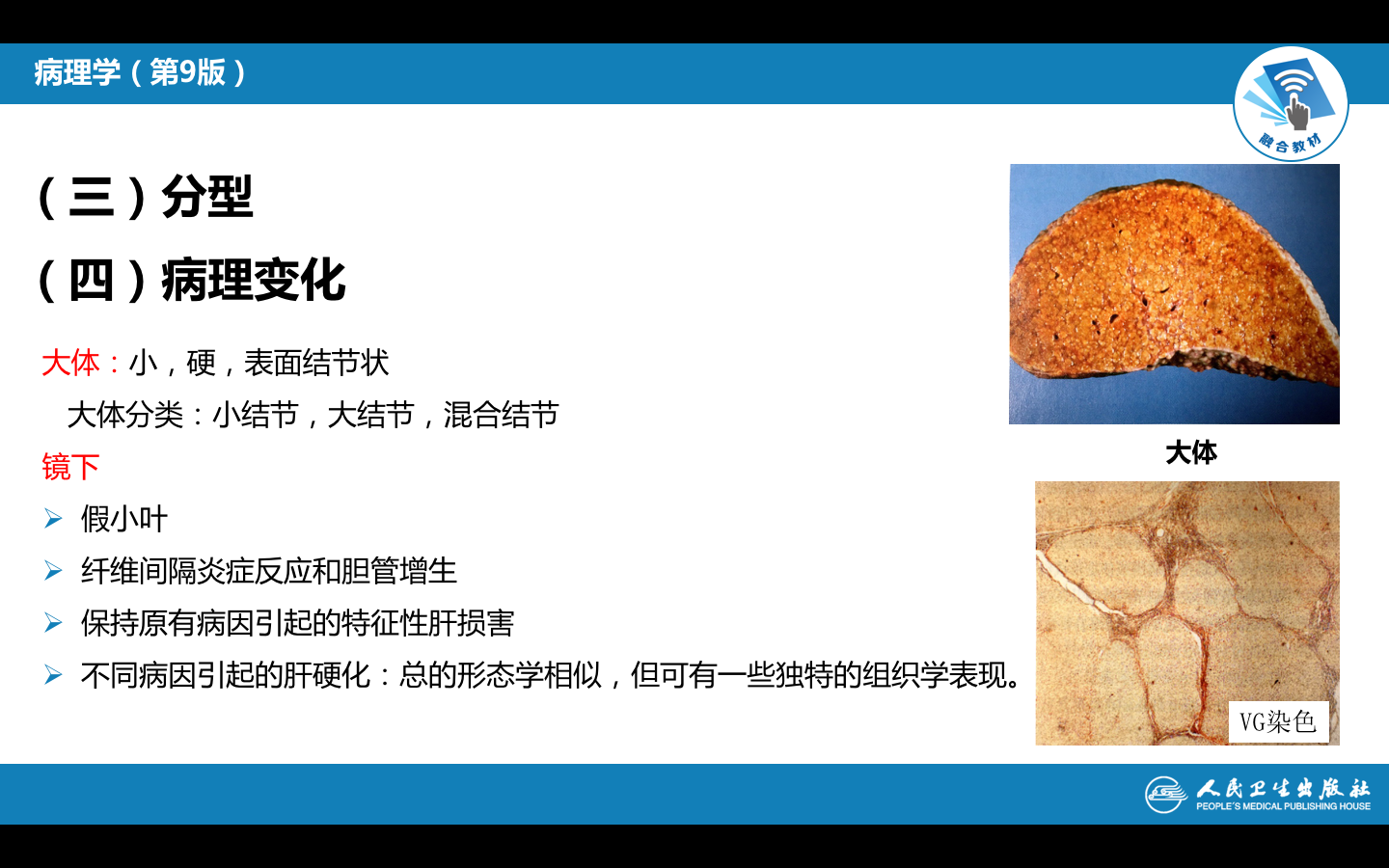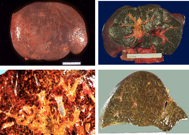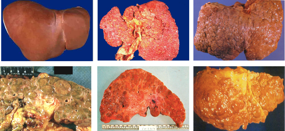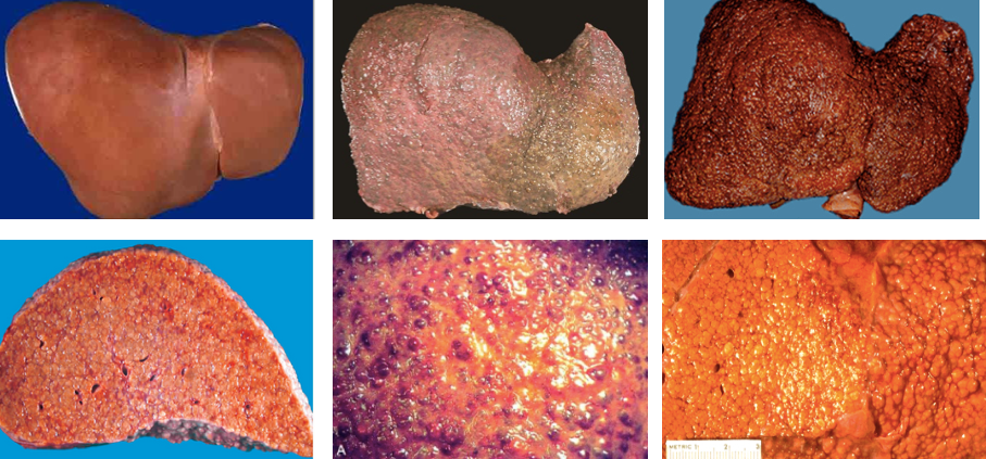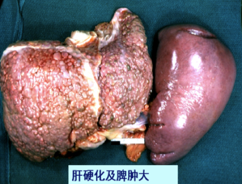 早、中期肝体积正常或略增大,质地正常或稍硬。后期肝体积缩小 ,重量减轻,由正常的1500g减至1000g以下。肝硬度增加,表面呈颗粒状或小结节状,大小相仿,最大结节直径不超过1.0cm。切面见小结节周围为纤维组织条索包绕。结节呈黄褐色(脂肪变)或黄绿色(淤胆)弥漫分布于全肝。