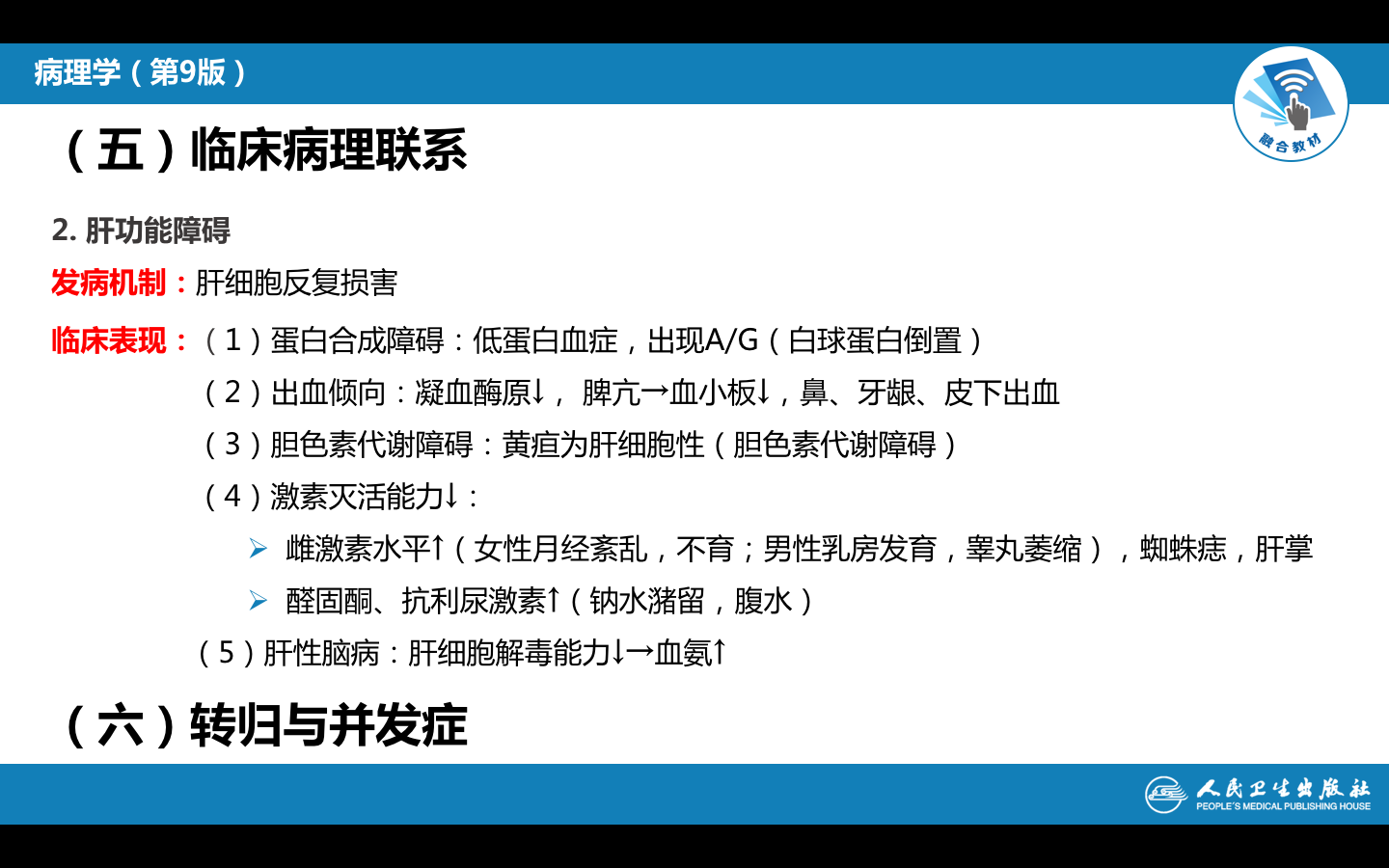 (5)肝性脑病(肝昏迷):是肝功能极度衰竭的结果,主要由于肠内含氮物质不能在肝内解毒而引起的氨中毒,是导致肝硬化患者死亡的又一重要原因。