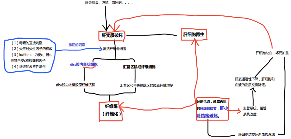 肝硬化的主要发病机制是进行性纤维化。正常肝组织间质的胶原(I和Ⅲ型)主要分布在门管区和中央静脉周围。肝硬化时I型和Ⅲ型胶原蛋白明显增多并沉着于小叶各处。随着窦状隙内胶原蛋白的不断沉积,内皮细胞窗孔明显减少,使肝窦逐渐演变为毛细血管,导致血液与肝细胞间物质交换障碍。肝硬化的大量胶原来自位于窦状隙(Disse腔)的贮脂细胞(Ito细胞),该细胞增生活跃,可转化成纤维母细胞样细胞。初期增生的纤维组织虽形成小的条索但尚未互相连接形成间隔而改建肝小叶结构时,称为肝纤维化。如果继续进展,小叶中央区和门管区等处的纤维间隔将互相连接,使肝小叶结构和血液循环改建而形成肝硬化。