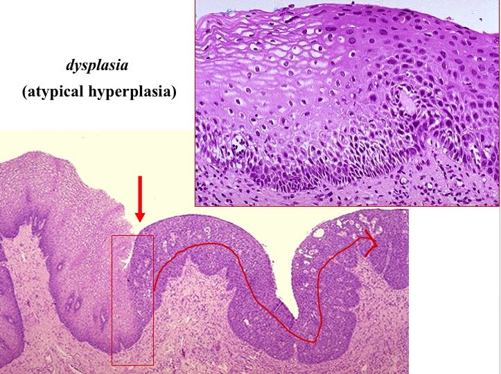 癌前疾病的形态学改变是组织内的细胞出现异型增生。 异型增生(dysplasia)是描述与肿瘤形成相关的非典型增生。异型增生上皮具有细胞和结构异型性,但并非总是进展为癌。异型增生好发于凝妆上皮,也可以发生于腺上皮。