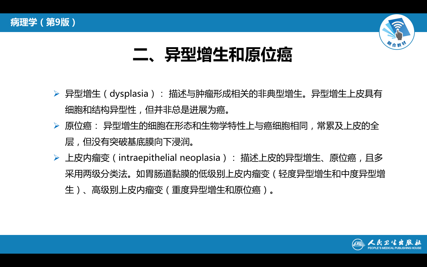 上皮内瘤变(intraepithelial neoplasia): 描述上皮的异型增生、原位癌,将轻、中、重度非典型性增生分别称为上皮内瘤变Ⅰ、Ⅱ、Ⅲ级,并将原位癌也列入上皮内瘤变Ⅲ级。目前上皮内瘤变多采用两级分类法。如胃肠道黏膜的低级别上皮内瘤变(轻度异型增生和中度异型增生)、高级别上皮内瘤变(重度异型增生和原位癌)。