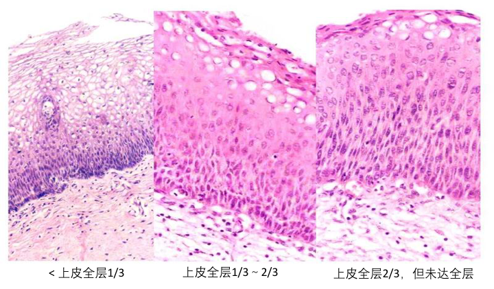 | 轻度:<上皮全层1/3 | 中度:上皮全层1/3~2/3 | 重度:>上皮全层2/3,但未达全层 |