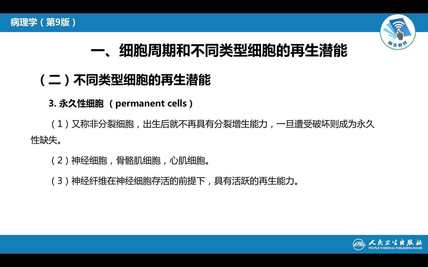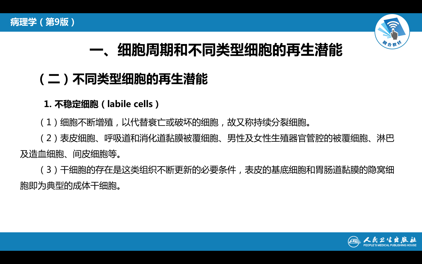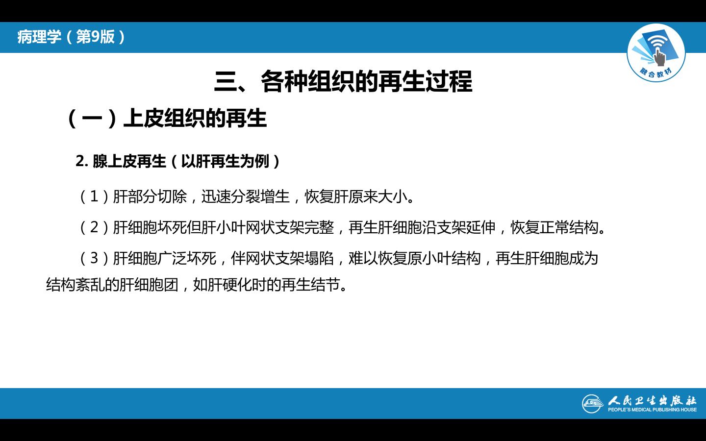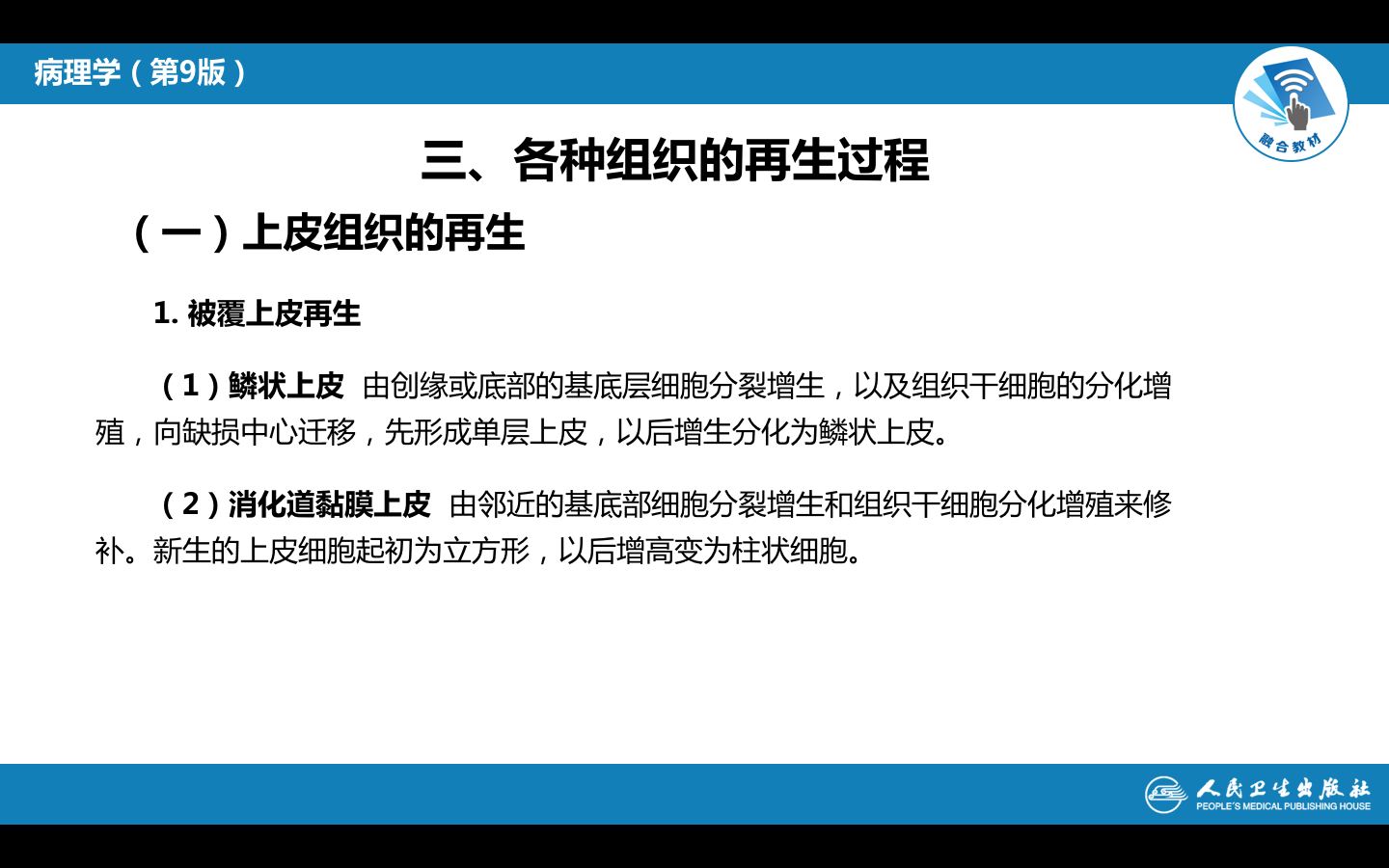在生理情况下,有些细胞和组织不断老化、凋亡,由新生的同种细胞和组织不断补充,始终保持着原有的结构和功能,维持组织、器官的完整和稳定,称生理性再生。如表皮的复层扁平细胞不断地角化脱落,通过基底细胞不断增生、分化,予以补充;月经期子宫内膜脱落后,又有新生的内膜再生;消化道粘膜上皮细胞每1~2天再生更新一次等。