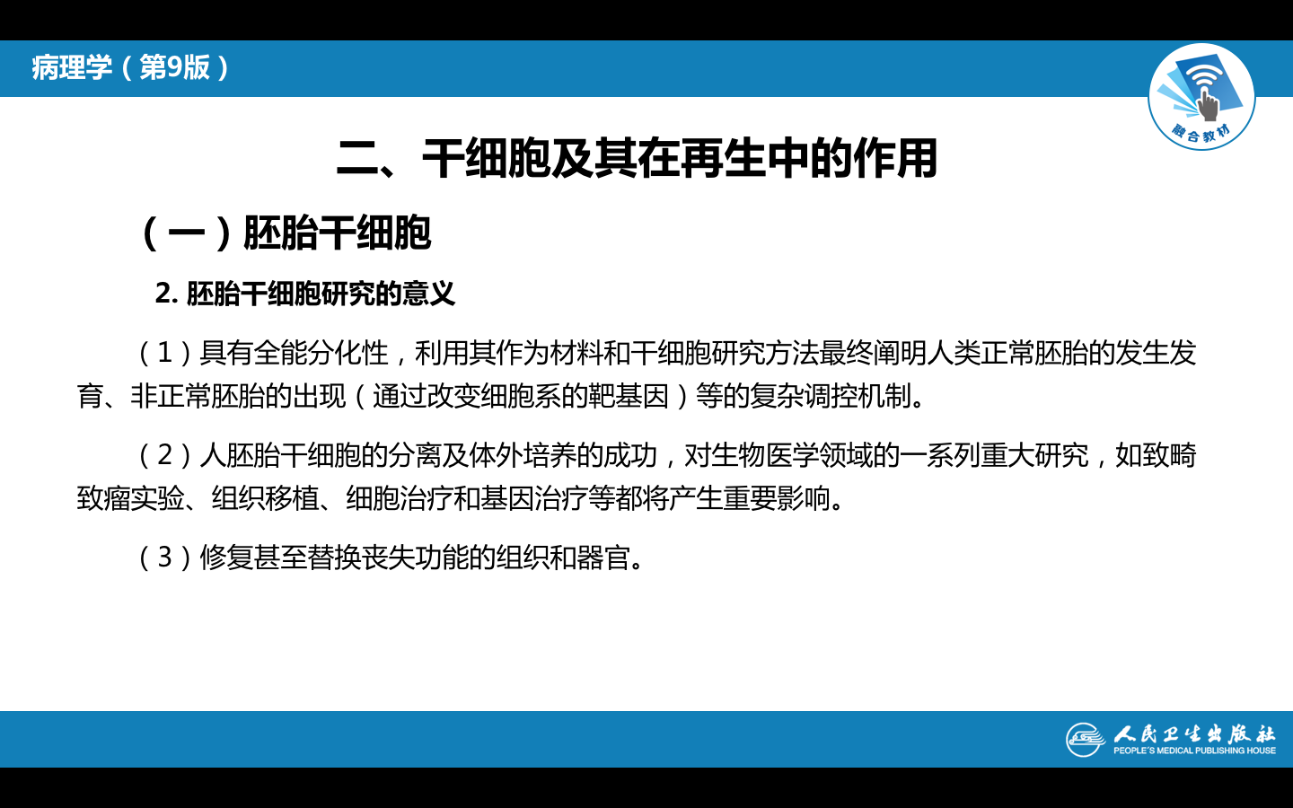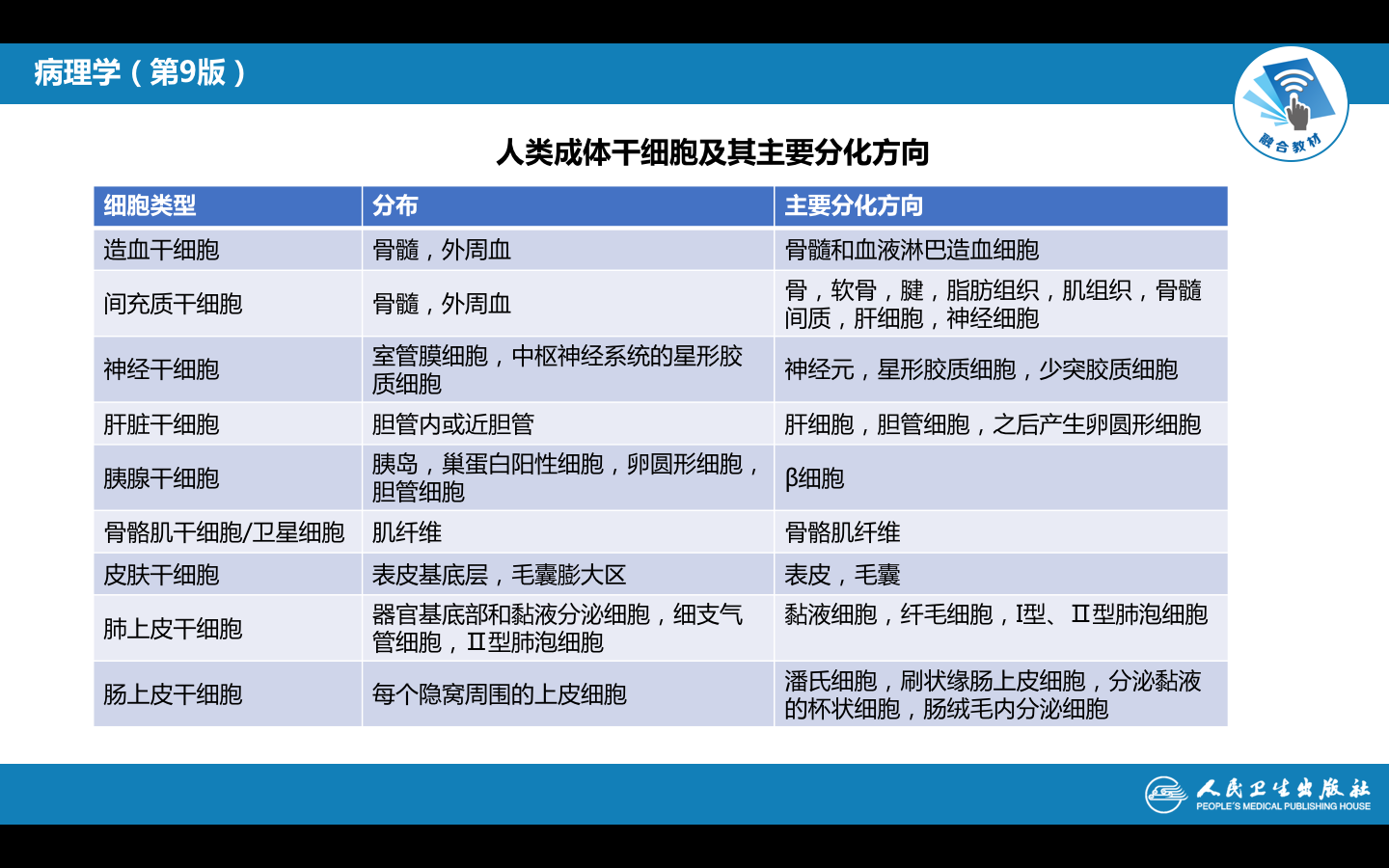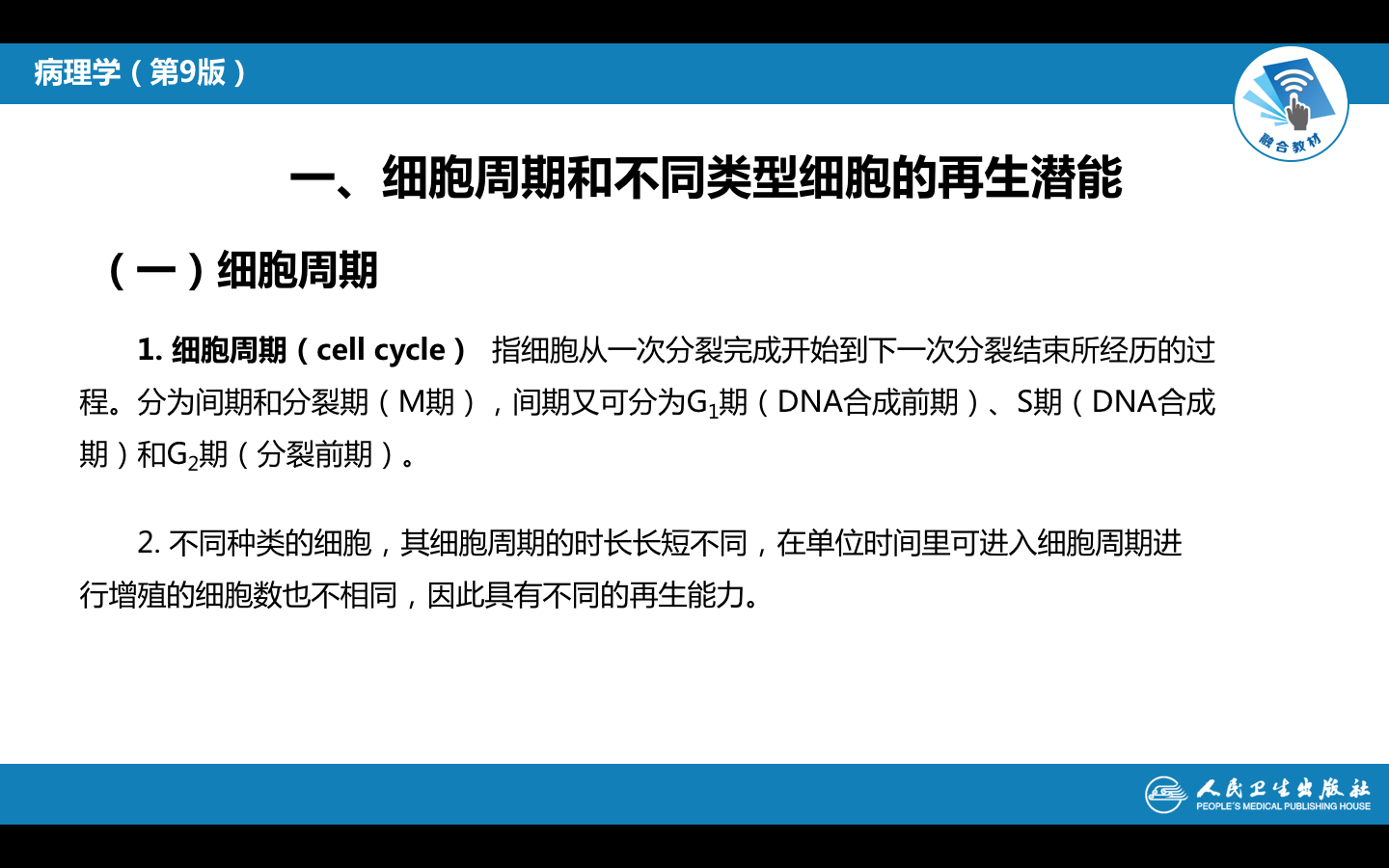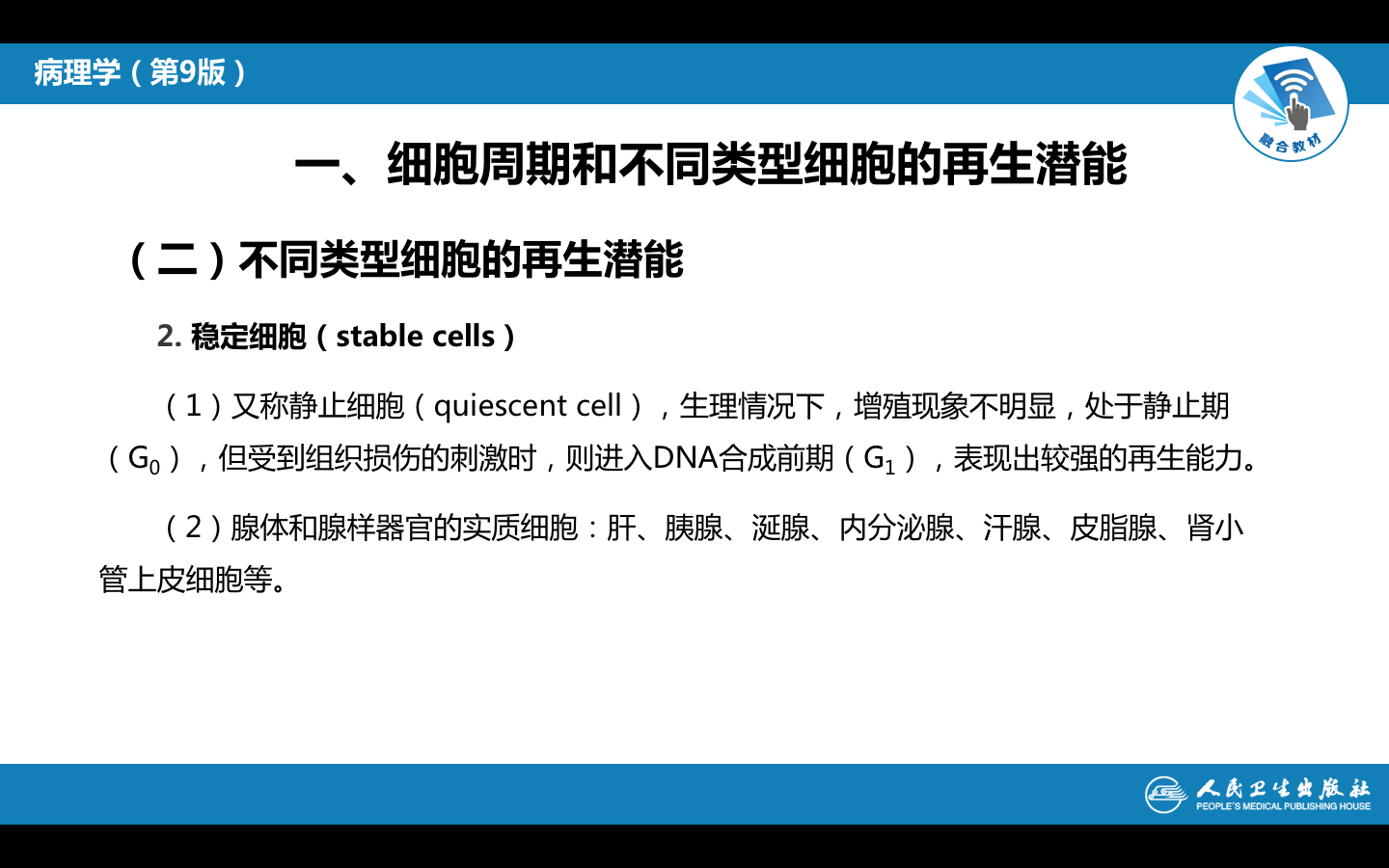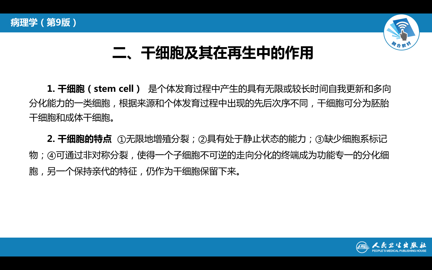 在生理情况下,有些细胞和组织不断老化、凋亡,由新生的同种细胞和组织不断补充,始终保持着原有的结构和功能,维持组织、器官的完整和稳定,称生理性再生。如表皮的复层扁平细胞不断地角化脱落,通过基底细胞不断增生、分化,予以补充;月经期子宫内膜脱落后,又有新生的内膜再生;消化道粘膜上皮细胞每1~2天再生更新一次等。