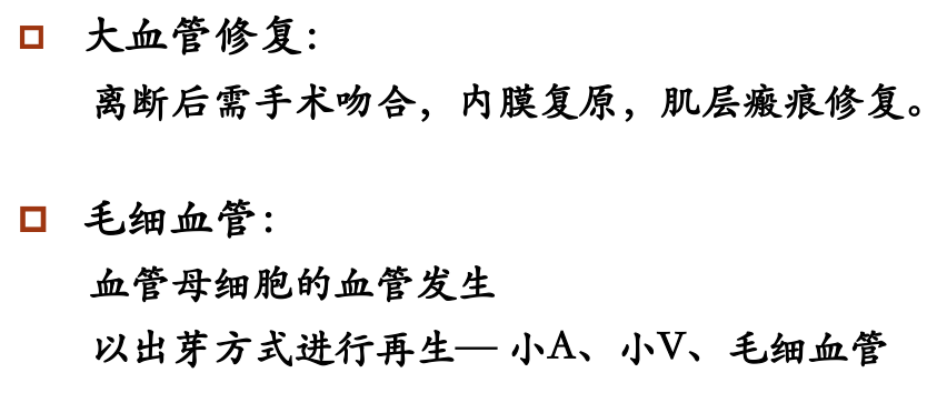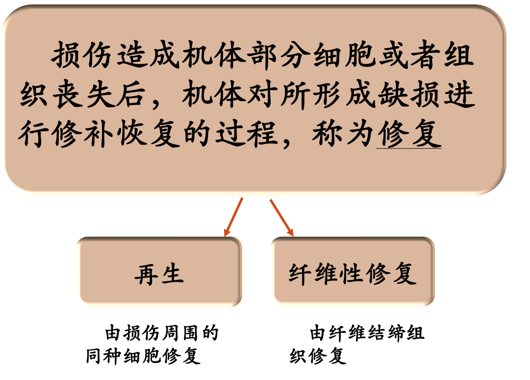 如果损伤的实质细胞有再生能力和适宜条件,则通过邻近存留的同种实质细胞再生进行修补恢复,因为此种修复可完全恢复原有细胞、组织的结构和功能,故称此为再生性修复或完全性修复;在病理状态下,如果实质细胞不能再生或仅有部分能再生,组织缺损则全部或部分由新生的富于小血管的纤维结缔组织(肉芽组织)来修补充填缺损,并形成瘢痕,因为它只能恢复组织的完整性,不能完全恢复原有的结构和功能,故称此为瘢痕性修复或不完全性修复。